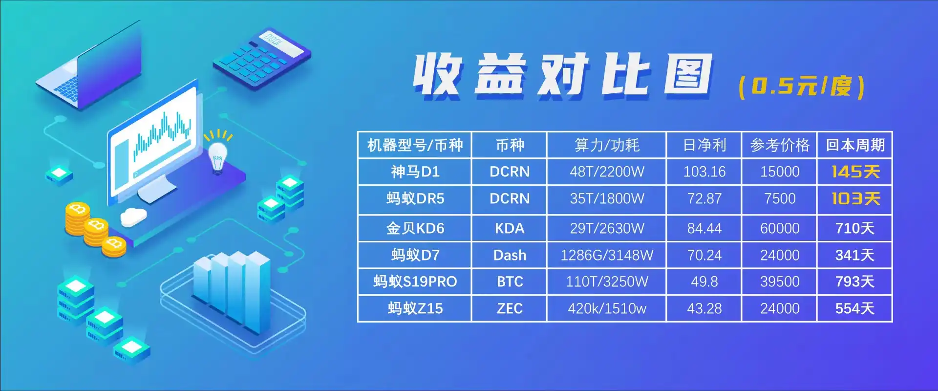 DCRN 能够被广大矿工快速关注的主要原因就是得益于超高的收益率和极短的回本周期,我们以 0.5 元一度电跟其他市场上主流币种的主力机型进行对比,不难发现 DCRN 的两款主流型号回本周期分别只有 103 天-145 天,且矿机门槛极低,蚂蚁 DR5 甚至不超过 8000 元。对比其他币种动辄上万的门槛来说是非常友好的了。此外除即将面临主网合并的 ETH 外,其他币种主力矿机回本周期均在一年以上,而 DCRN 只需要 3-4 个月就可以轻松回本。
