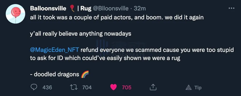这是 Magic Eden 上最初的一个 Rug 项目 Balloonsville 对其进行的嘲讽。Balloonsville 系列中有 5,000 个 NFT,通过 Magic Eden 的 Launchpad 进行 mint,成功赚取了超过 17,890 SOL(当时价值 200 万美元),然后宣布这一切都是其精心策划的骗局。