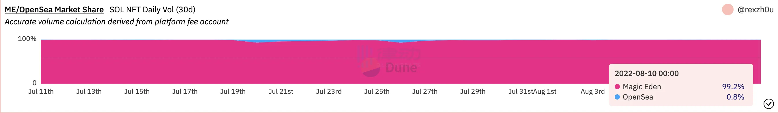 不过,三个多月过去了,OpenSea 上的 Solana NFT 的交易这部分的使用率却一直不温不火,并未出现太大起色。Dune 用户 rexzh0u 提供的数据显示,8 月 10 日,Solana NFT 每日交易额的占比,OpenSea 只占 0.8 %,并且长期不超过 10%,可见 Magic Eden 在这块的地位仍难以撼动。