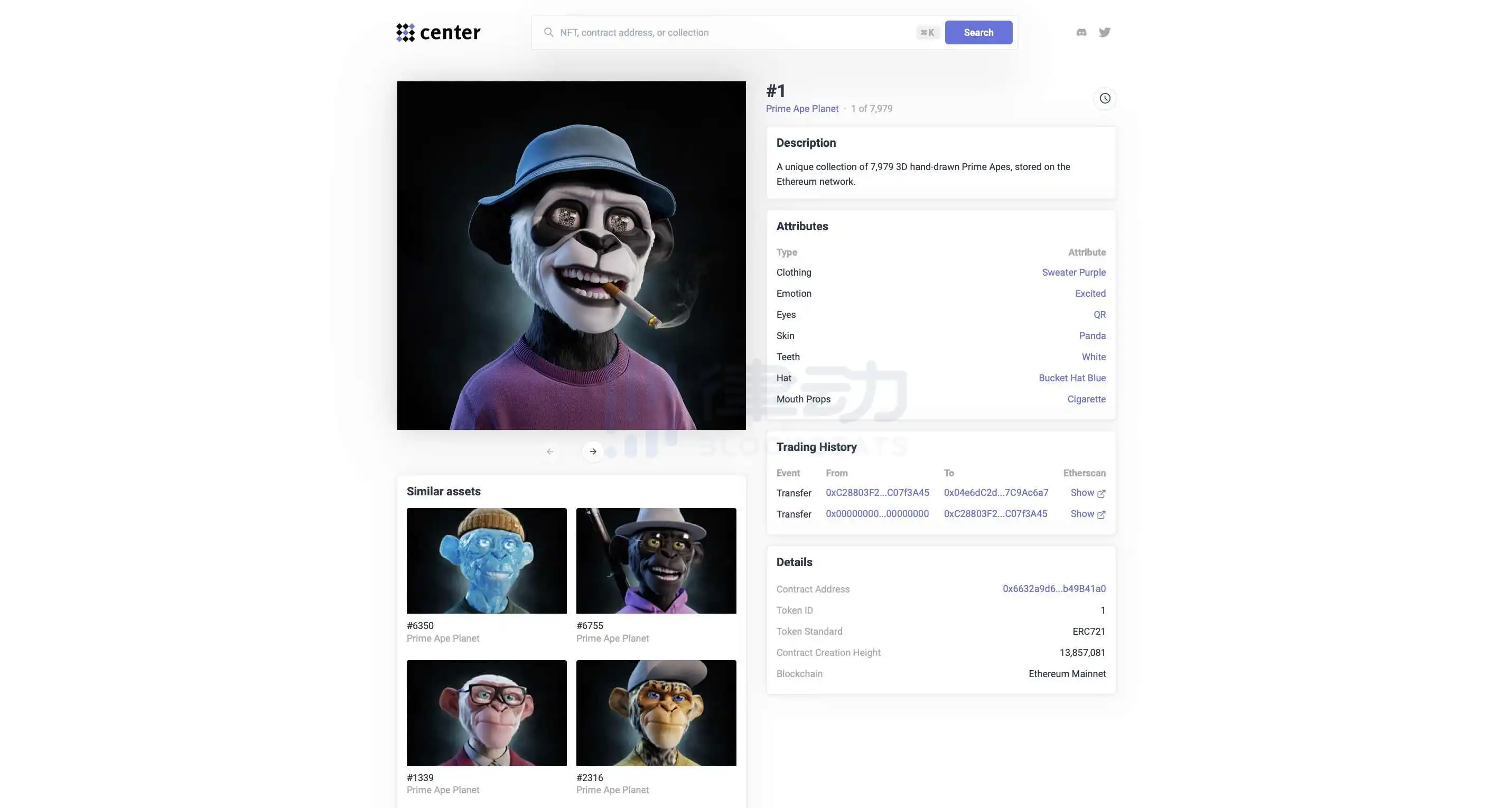 依然以左上角的 #1 为例,点开后可查看该 NFT 的具体详情,从中可了解其归属区块链、属性、交易历史等信息,页面还会推荐类似资产供用户了解。