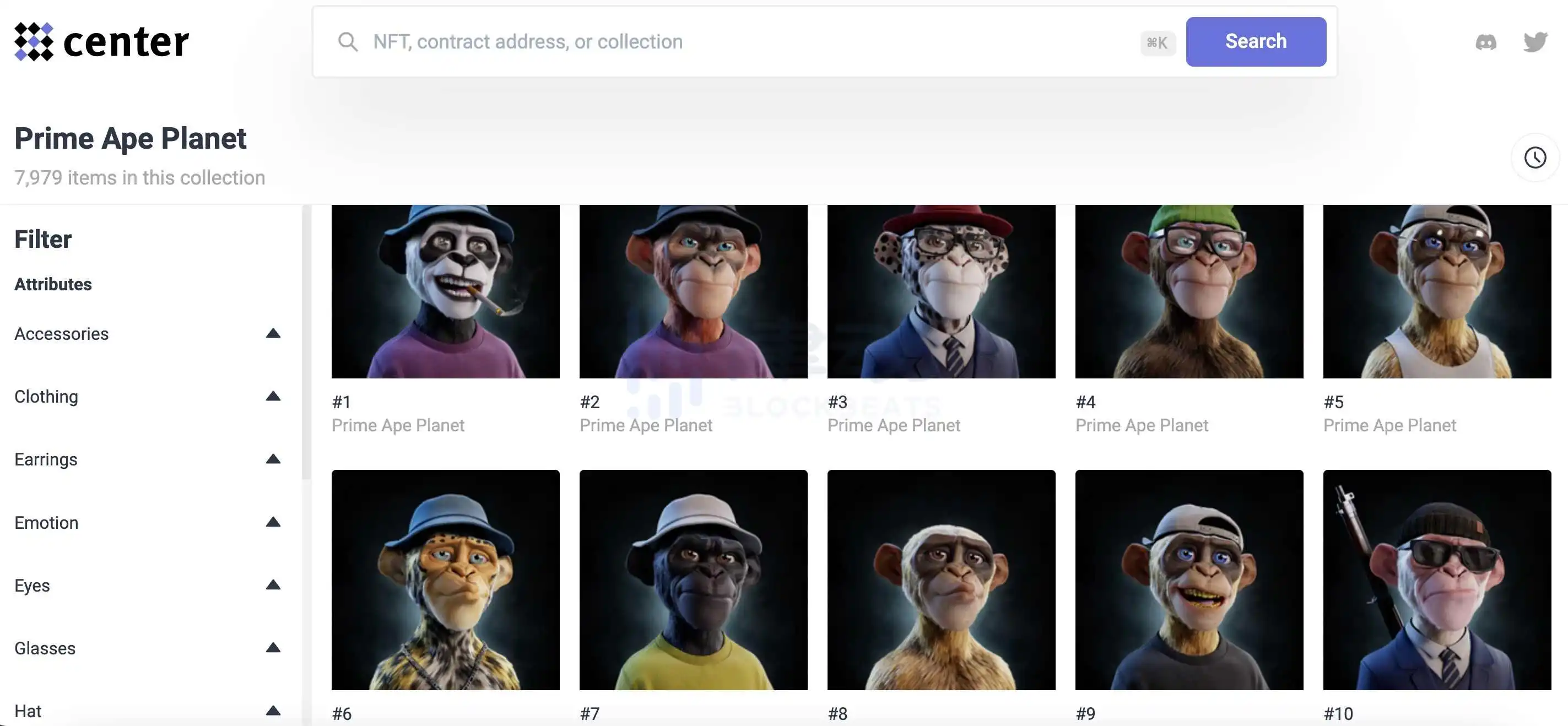NFT 搜索引擎的出现使人们可以快速找到自己需要的 NFT 相关数据。上图显示出,用户搜索 ape 后会展示出不同链上所有相关 NFT,以图片左上角的 Prime Ape Planet 为例,点击进去后,可查看其总数,亦可筛选属性进行搜索。