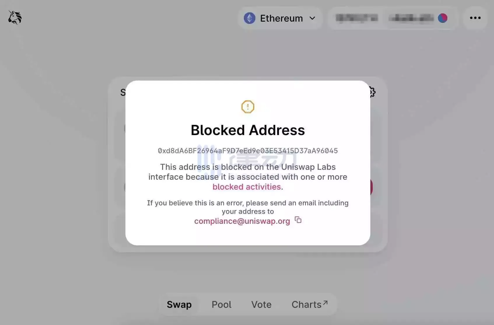 8 月 14 日,据社区消息显示,Uniswap 前端现已开始对收到 Tornado Cash 相关地址转账污染的地址进行封禁。提示内容显示「该地址被 Uniswap Labs 界面阻止,因为该地址与一个或多个被禁止的活动相关。」