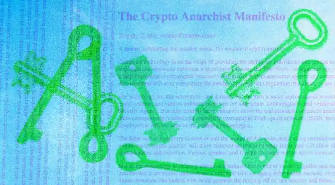 「计算机技术即将为个人和团体提供以完全匿名的方式进行交流和互动的能力。两个人可以在不知道对方真实姓名或法律身份的情况下交换信息、开展业务和谈判电子合同。在网络上的互动将是不可追踪的...... 这些发展将完全改变政府监管的性质,对经济互动进行征税和控制及对信息进行保密的能力,甚至将改变信任和声誉的性质。」-Timothy C. May,「加密无政府主义宣言」,1988 年