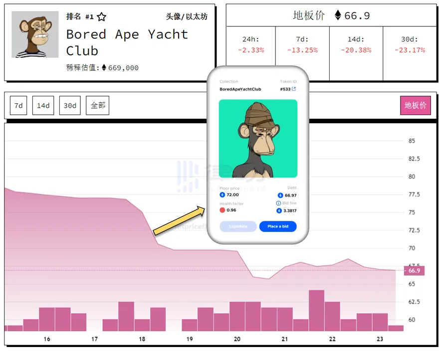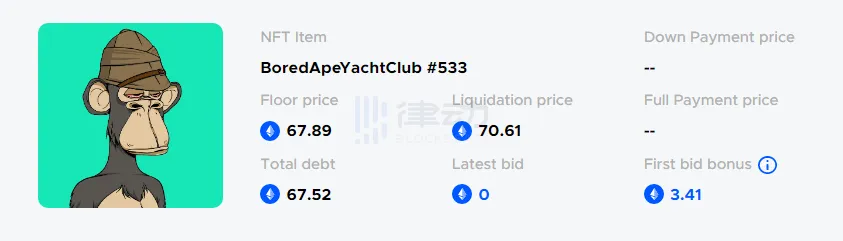 8 月 18 日,BAYC 的地板价下跌至 72 ETH 左右,而此前曾在 BendDAO 上抵押借贷的 BAYC#533 的有利息债务为 66.97 ETH。