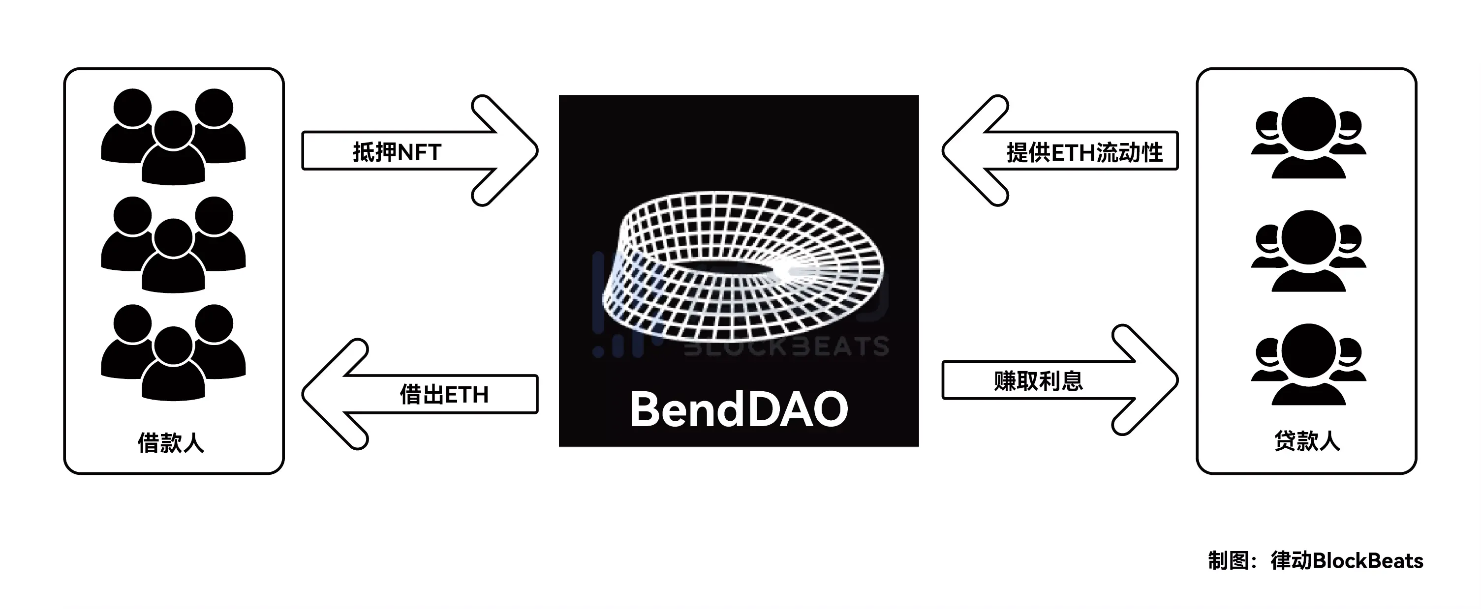通过 BendDAO,贷款人可以向借贷池提供 ETH 流动性以赚取利息,借款人可以将 NFT 作为抵押品即时在借贷池借入 ETH。