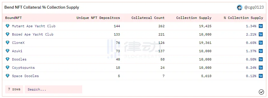 参与 BendDAO 借贷的 NFT 在其对应的 NFT 系列中都是占比极小