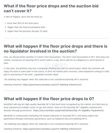 其次,目前正在拍卖清算的 NFT 并不是挂单到 OpenSea 等 NFT 交易平台出售,也就是说,它不会拉低二级市场的地板价,进而重新喂价给 BendDAO 的预言机,造成平台内部的抵押的 NFT 被进一步清算。