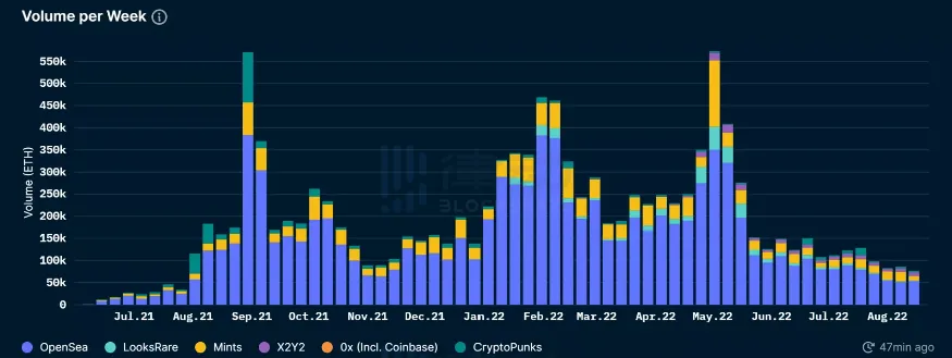 近来 NFT 市场持续低迷,交易量连续下挫屡创新低,据报道,NFT 周交易量(8 月 9 日至 15 日)达 76,637 枚 ETH,创历史新低,已连续 13 周低于 15.3 万枚 ETH。