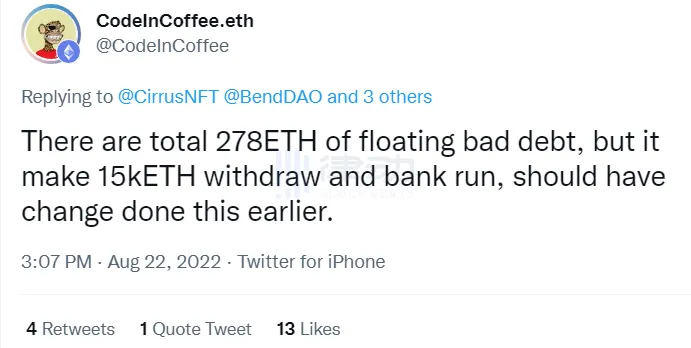 BendDAO 创始人表示开始仅有 278ETH 的坏账,但这造成了后续的挤兑