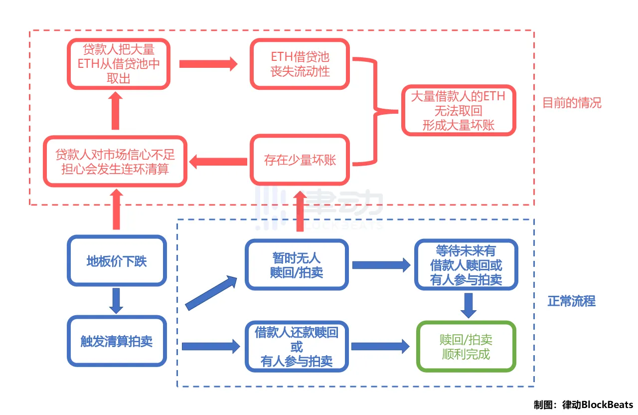 2. 不理想情况下的流程:由于短期价格剧烈波动,短期内借款人未还款赎回且无人参加拍卖,则只需等待,要么等待未来借款人会还款赎回,要么等待未来市场价格回升后,有清算人参与拍卖。