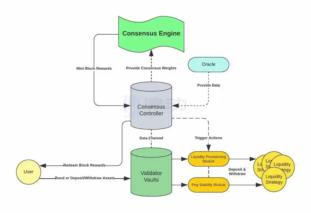 用户将各种资产存入共识保险库系统中,从而获得代表其存款的 Token 化份额(类似于旨在统一 DeFi 收益标准的 ERC-4626),这些 Token 化份额将用于治理,用户也可将自己的存款委托给特定的验证者,从而将共识投票权分配给他们选择的验证者 (类似于 DPOS 委托权益证明系统)。