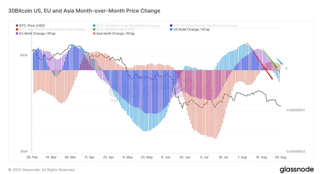 综合活跃地址变化,呈现出同样趋势,这代表着近期市场流动性下降且情绪低迷,即使在先前发生了一次较大的下跌,也未有明显的恢复。