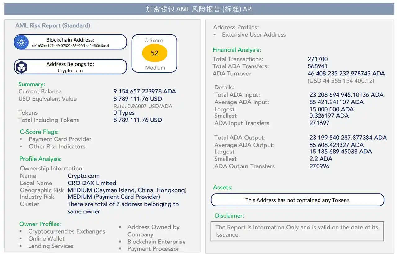 只需要输入钱包地址,工具即可自动化给出 AML 风险报告,并对该地址进行打分,使用 0-99 反映非法加密活动风险。