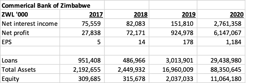5. 随着通货膨胀的到来,收益率也在大幅增长。通货膨胀增加了所有东西的名义价格,所以也会顺势让公司的收益获得爆炸式的增长。经济学家总是喜欢谈论「实际」收益,但股市价格却是基于名义收益。美国今年的通货膨胀率为 8%,公司收益就已经能给人很大的惊喜了,而下图是津巴布韦商业银行 4 年的盈利趋势,每股收益从 2017 的 5 津币(ZWL)上涨到了 2020 年的 1184 津币。当然,期间外汇汇率也由 1 ZWL/$ 上升至了 220 ZWL/$。
