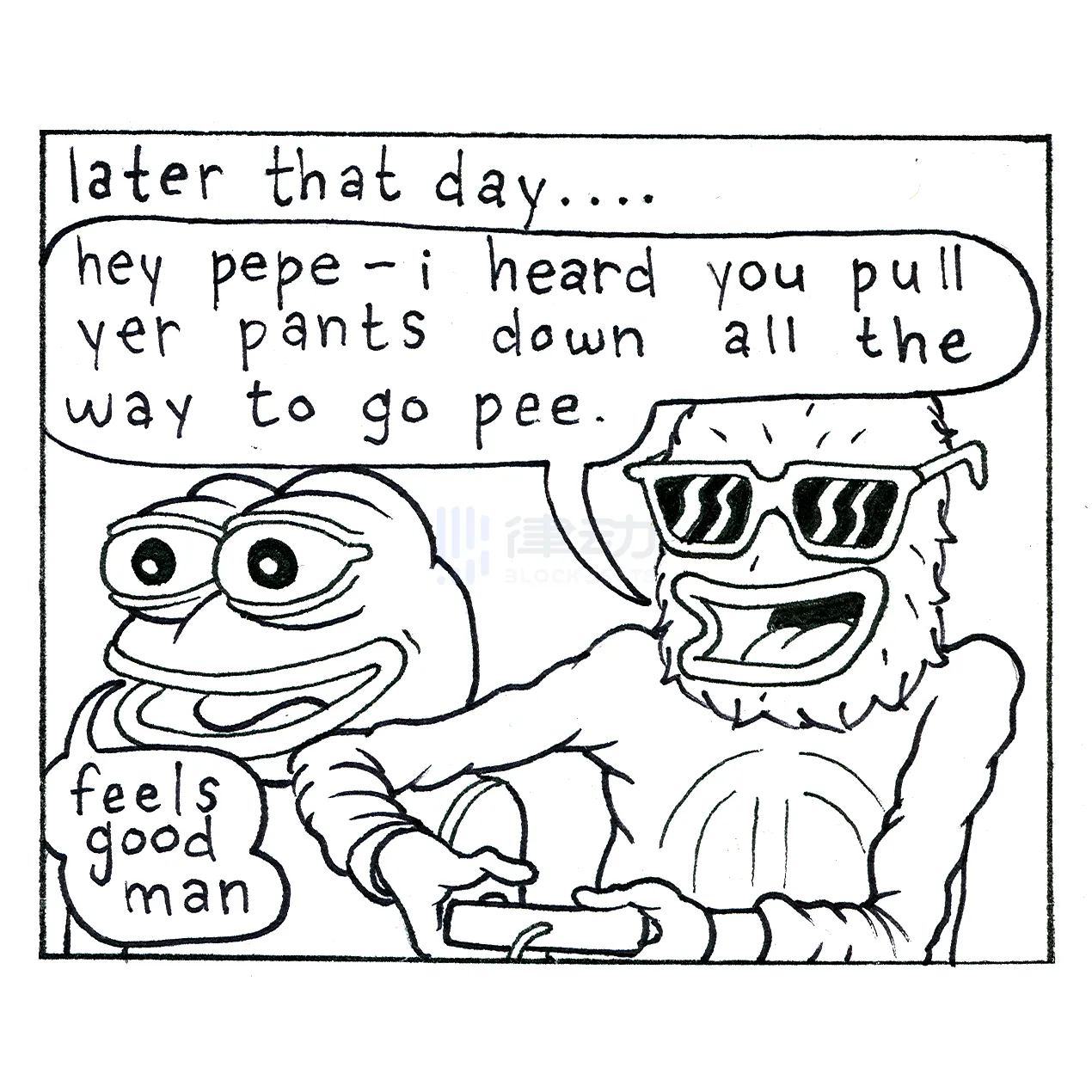 Matt Furie 正是「Pepe the frog」的创作者。在与 Meme 天作之合的 NFT 市场,作为当代最知名的 Meme 之一的「Pepe the frog」自然书写了自己的辉煌。2021 年 4 月,Matt Furie 授权的第一个「Pepe the frog」NFT——「Feels good man」在 Chain/Saw 平台上被 punk4156 以 420 ETH(约 102 万美元)的价格购入,他将「Pepe the frog」称之为「当代的蒙娜丽莎」。大约半年后,punk4156 在 OpenSea 上将这个「当代的蒙娜丽莎」的创世 NFT 以 1000 ETH(约为 351 万美元)的价格售出。