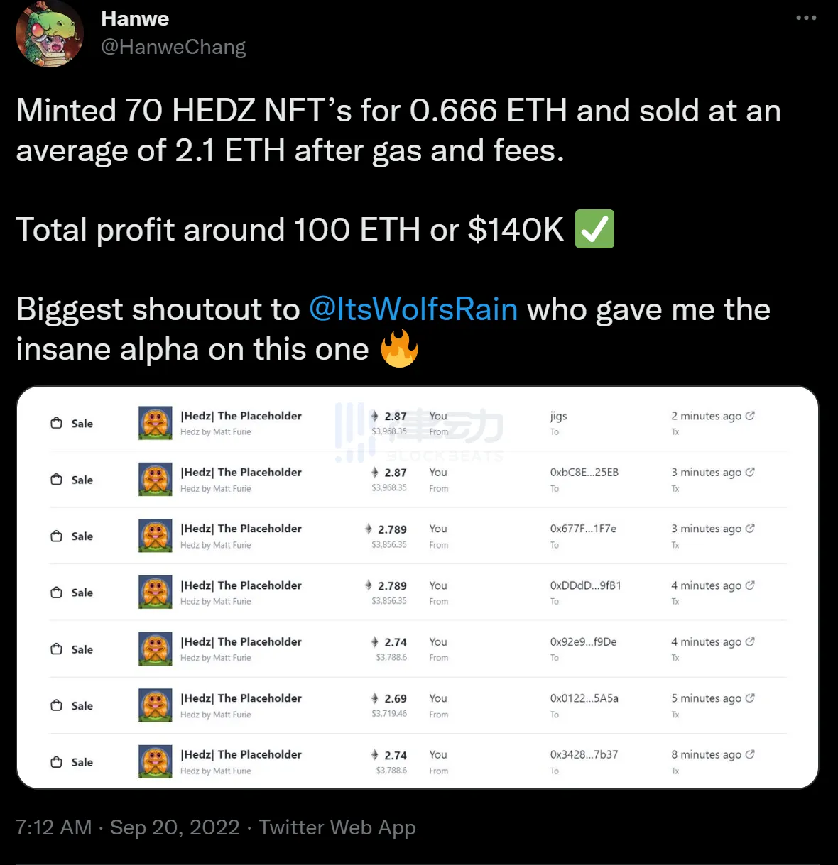 玩过魔兽争霸 3 的朋友想必都知道,兽族的英雄「剑圣」有一个叫「致命一击」的技能,俗称「跳劈」。当这个技能触发的时候,平 A 就会转成暴击,一下带走敌人。Hanwe 的挑战成功像极了一次暴力的「跳劈」——他一口气铸造了 70 个「Hedz by Matt Furie」NFT,并且以 2.1 ETH 的均价全部售出,仅通过这一个项目就收获了近 100 ETH(约 14 万美元)的利润。