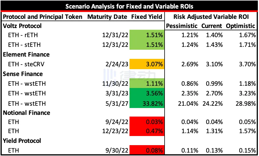 虽然上述所有协议都允许用户持有固定利率头寸,但只有少数几个(Voltz Protocol、Element Finance、Sense Finance、Notional Finance 和 Yield Protocol)提供了我认为与 ETH 质押奖励率相当的收益产品。