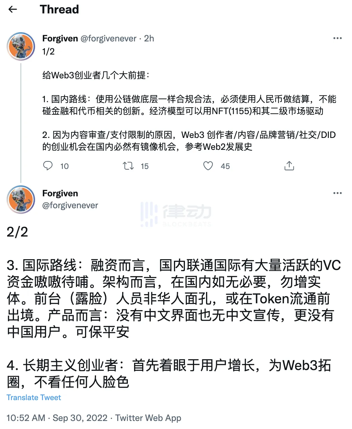 3. 国际路线:融资而言,国内联通国际有大量活跃的 VC 资金嗷嗷待哺。架构而言,在国内如无必要,勿增实体。前台(露脸)人员非华人面孔,或在 Token 流通前出境。产品而言:没有中文界面也无中文宣传,更没有中国用户可保平安。