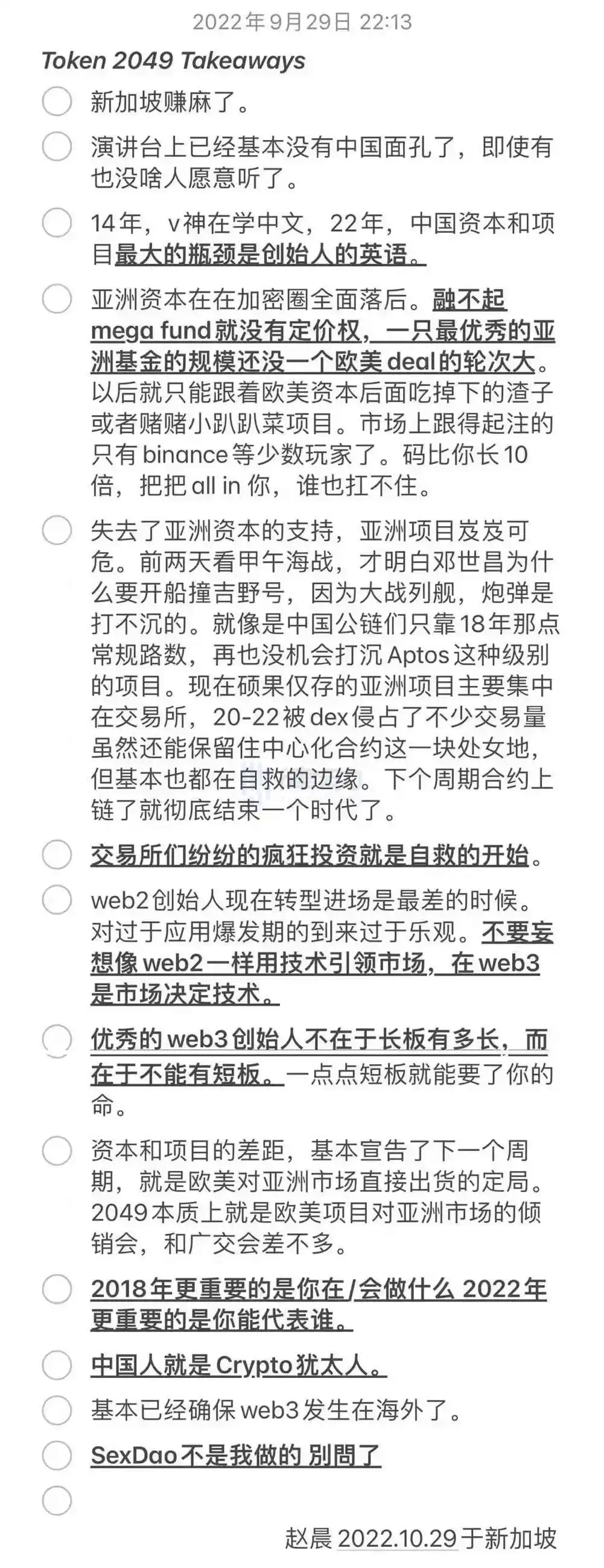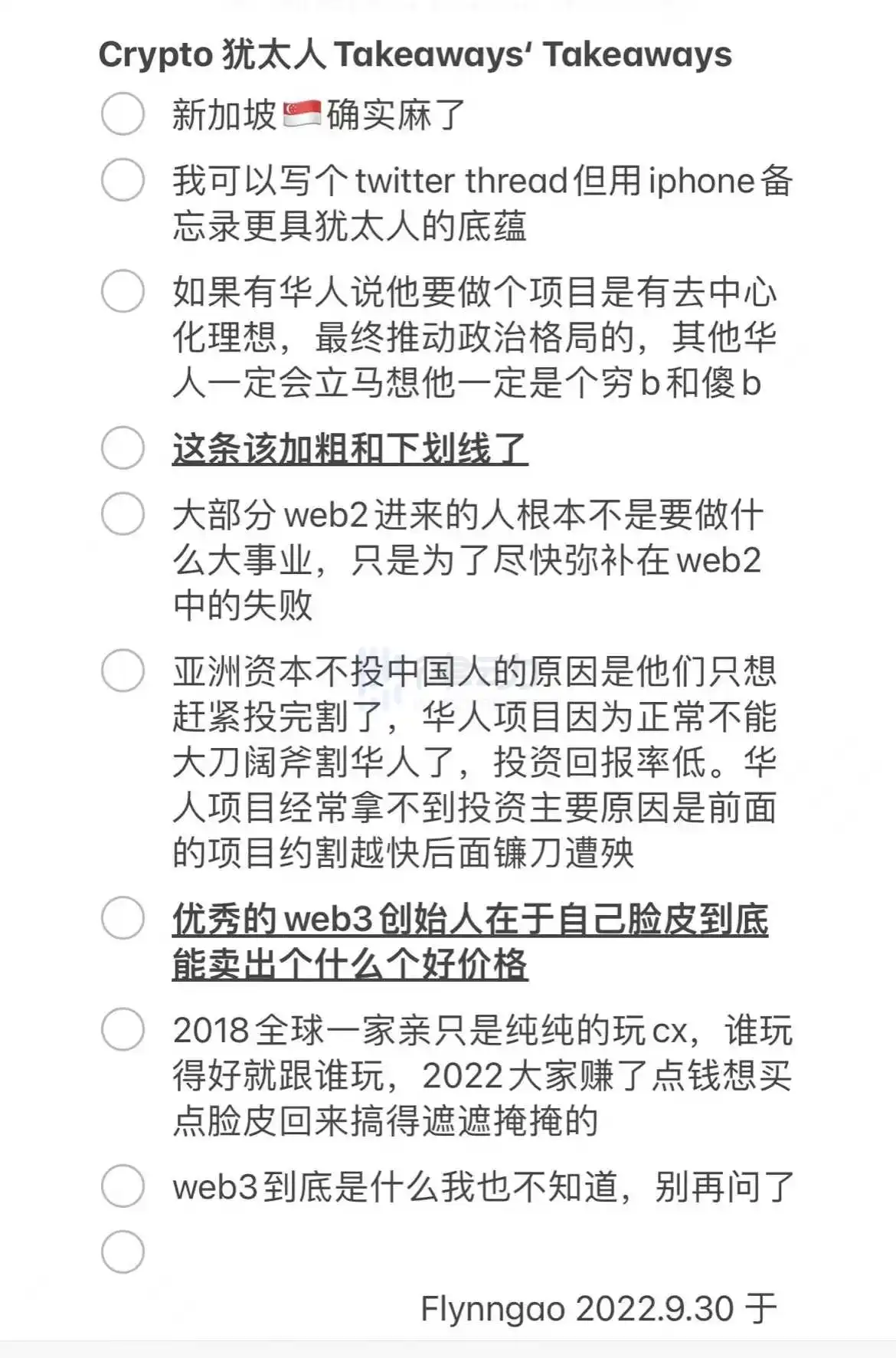 9 月 28 日,新加坡 Token2049 活动顺利结束。这是几个月来首场 Web3 盛会,现场人头攒动,Web3 还是很热闹。但与会的国内从业者却高兴不起来,在「回到自己 1 万元一晚的酒店」后,他们对国人 Web3 项目和创始人的未来感到前所未有的无助。此次 Web3 大会,人们好像感受到来自「欧美 Web3」的巨大压迫感,我们,似乎成了「Crypto 世界的犹太人」。