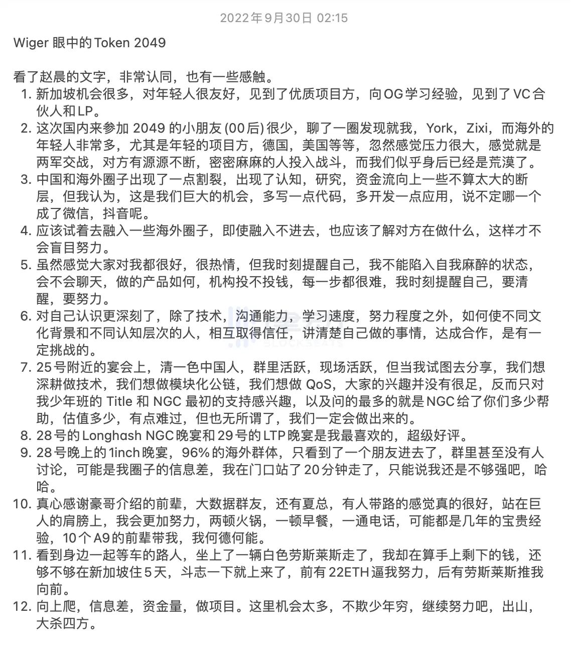2.这次国内来参加 2049 的小朋友(00 后)很少,聊了一圈发现就我,York,Zixi,而海外的年轻人非常多,尤其是年轻的项目方,德国,美国等等,忽然感觉压力很大,感觉就是两军交战,对方有源源不断,密密麻麻的人投入战斗,而我们似乎身后已经是荒漠了。