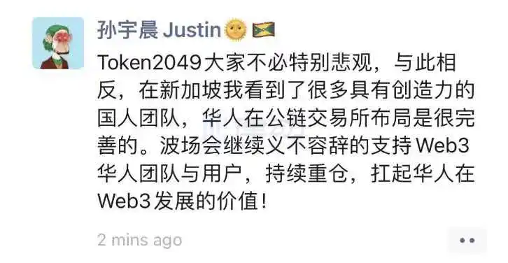 Token2049 大家不必特别悲观,与此相反,在新加坡我看到了很多具有创造力的国人团队,在公链交易平台布局是很完善的。波场会继续义不容辞地支持 Web3 华人团队与用户,持续重仓,扛起华人在 Web3 发展的价值!