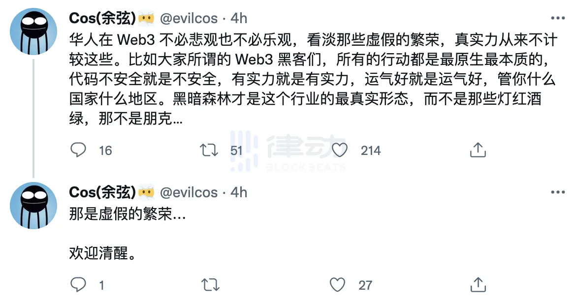 华人在 Web3 不必悲观也不必乐观,看淡那些虚假的繁荣,真实力从来不计较这些。比如大家所谓的 Web3 黑客们,所有的行动都是最原生最本质的,代码不安全就是不安全,有实力就是有实力,运气好就是运气好,管你什么国家什么地区。黑暗森林才是这个行业的最真实形态,而不是那些灯红酒绿,那不是朋克,那是虚假的繁荣...