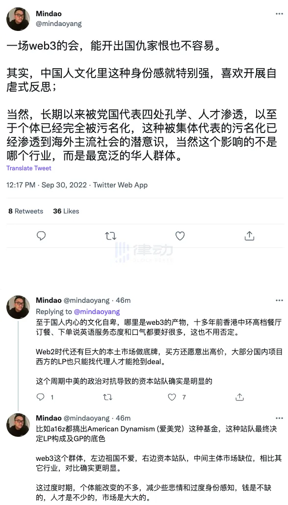 一场 Web3 的会,能开出国仇家恨也不容易。 其实,中国人文化里这种身份感就特别强,喜欢开展自虐式反思; 当然,长期以来被党国代表四处孔学、人才渗透,以至于个体已经完全被污名化,这种被集体代表的污名化已经渗透到海外主流社会的潜意识,当然这个影响的不是哪个行业,而是最宽泛的华人群体。