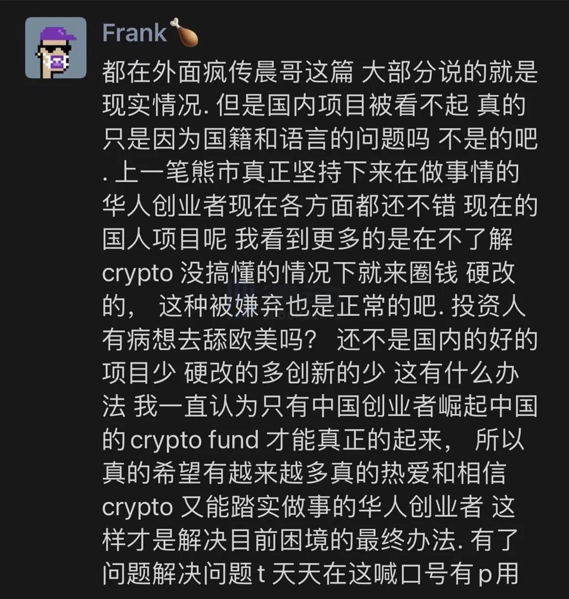 上一笔熊市真正坚持下来在做事情的华人创业者,现在各方面都还不错。现在的国人项目呢,我看到更多的是在不了解 crypto,没搞懂的情况下就来圈钱、硬改的,这种被嫌弃也是正常的吧。