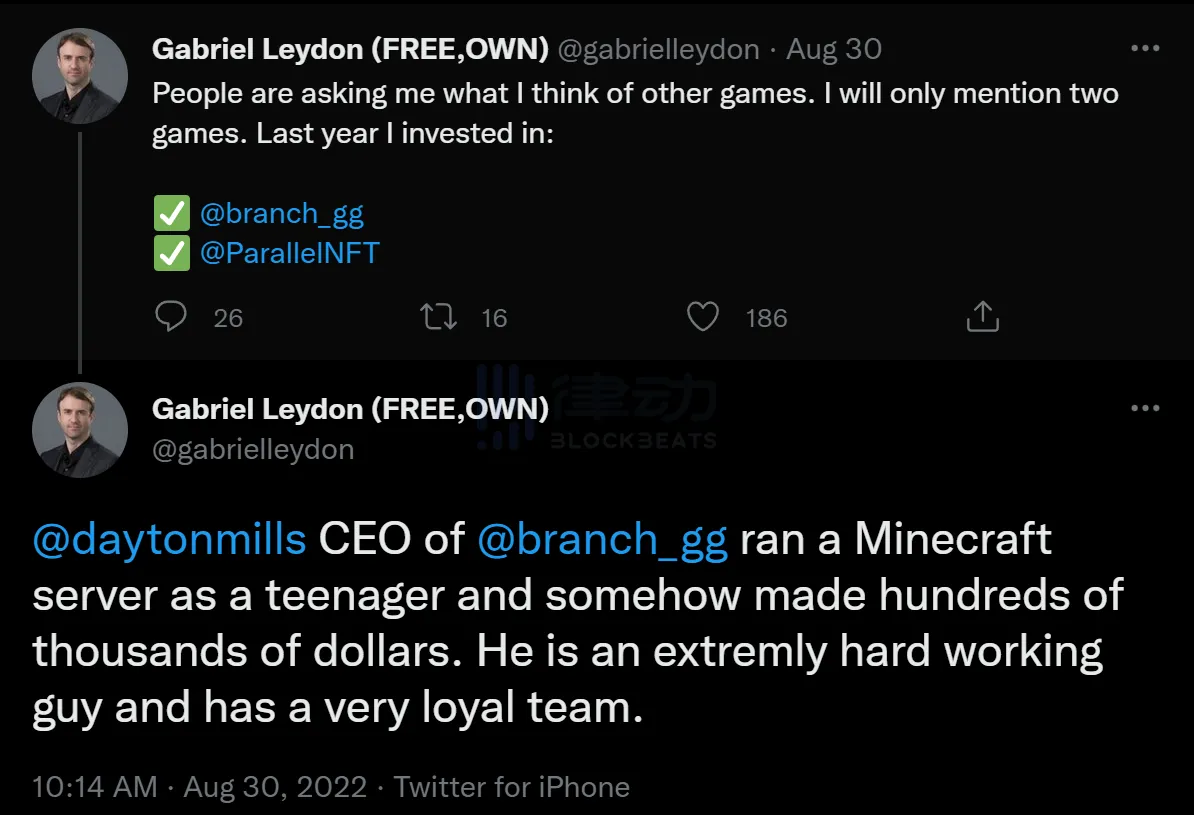 特别值得一提的是,DigiDaigaku 母公司 Limit Break 的 CEO Gabriel Leydon 也投资了 Branch。对 Dayton 这个小老弟,Gabriel 很是夸赞,说 Dayton 又勤奋又有领导力,还宣扬了 Dayton 年纪轻轻就用 MineCraft 赚了「第一桶金」的辉煌事迹。