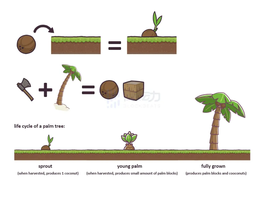 下图是 Castaways 官方的「椰子种植说明书」,从这个示例中,我们能够一窥资源采集与种植玩法的衔接。砍伐一棵完全长大的椰子树,可以得到椰子与适合椰子生长的「土壤」。把椰子再种回去,又可以得到一棵椰子树,重复种植就能成为「椰子大亨」。在椰子生长的不同阶段进行采集,得到的资源也会不同。