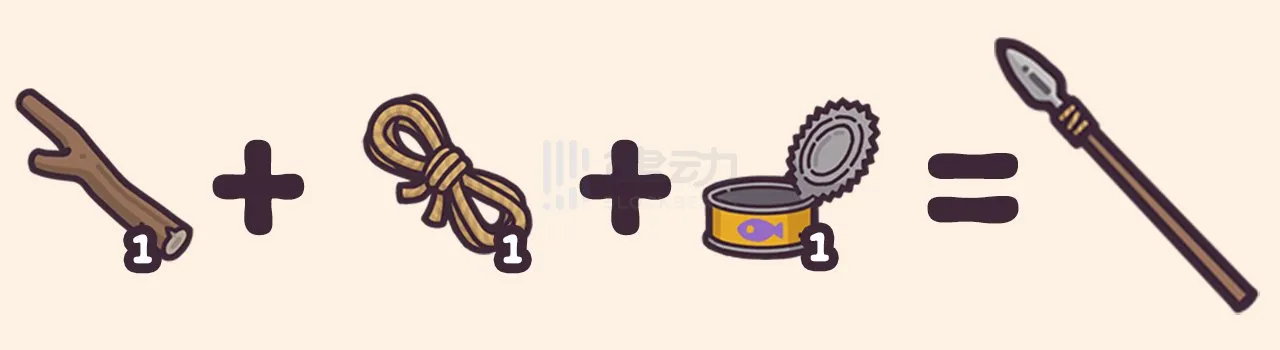 用一个树枝、一个绳索加一个被吃光的金枪鱼罐头,可以造出一把长矛作为武器:
