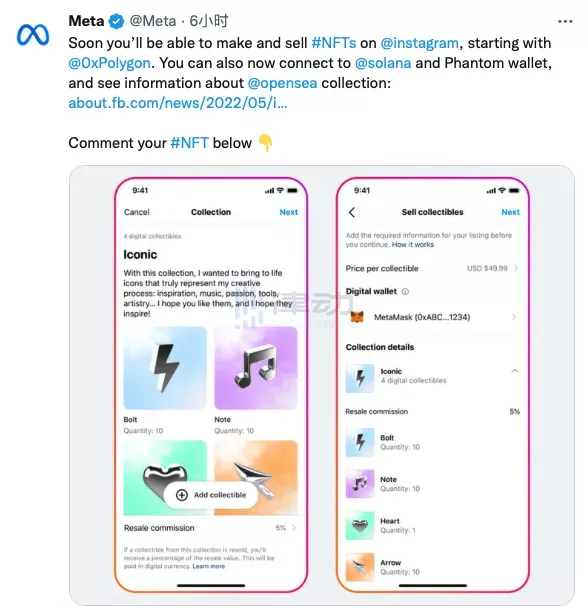 BlockBeats 消息,11 月 3 日,Meta 宣布旗下 Instagram 正在通过其应用程序开发 NFT 铸造和销售功能,允许用户设计铸造 NFT 并通过 Instagram 进行销售。Instagram 还将从 OpenSea 获取 NFT 元数据,使用户可以在 Instagram 上查看 NFT 信息。Meta 将首先向指定的艺术家和内容创作者开放新的 NFT 功能,未来会将这些功能提供给更广泛的用户。