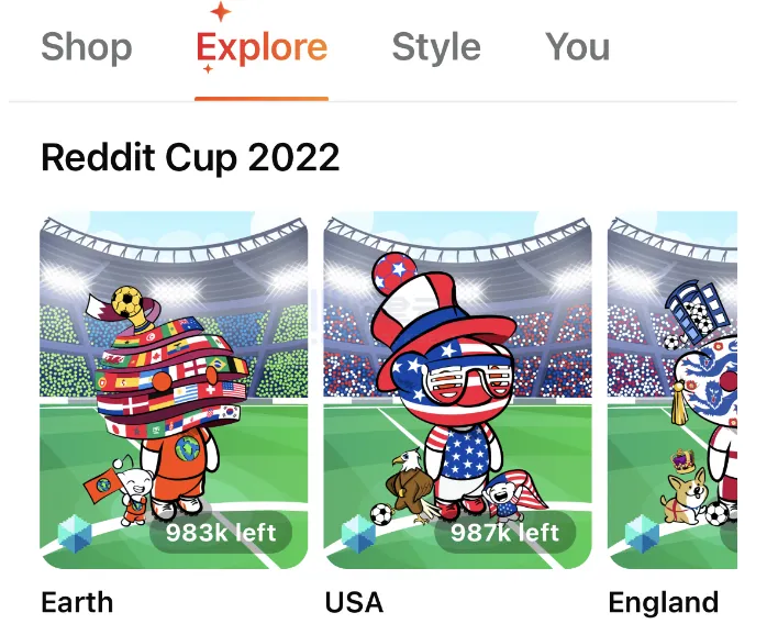 2. 点击个人头像,在 Explore 栏选择你最喜欢的 NFT(共有 33 种不同的样式—1 个 Earth 和本次参加世界杯的 32 个国家),当然你可以根据 Style 一栏改变 avatar 的样式。