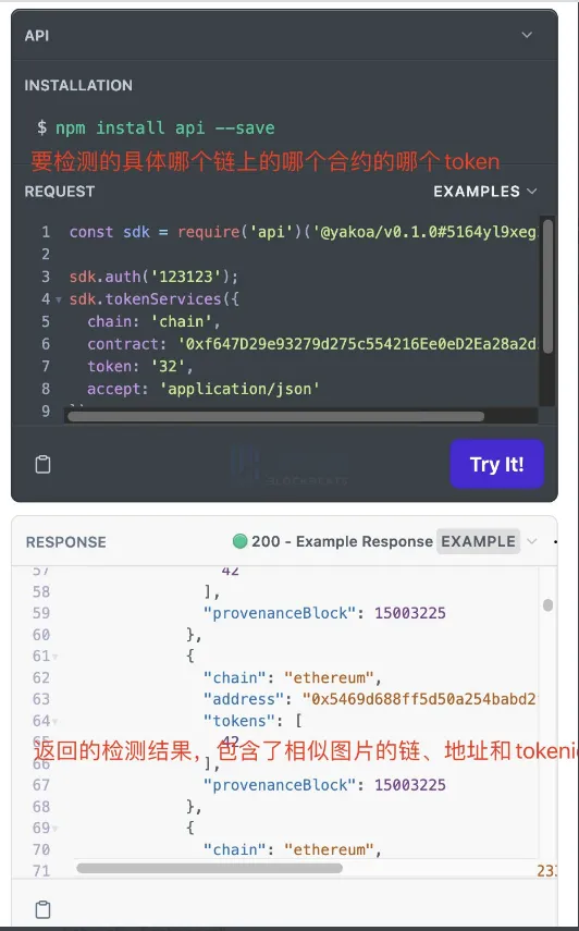 如下图为跑的一个案例,调用接口设置好要检测的具体 NFT,输入所在的链、合约地址、tokenid 后,会按照资产模型的格式返回 N 个结果,所以你可以将其理解成 NFT 领域的以图搜图,具体的场景我觉得现在还没被探索出来,毕竟如上文所说实现看得见但是如何管的着呢?Uinswap 投资后不知如何应用于 genie,拭目以待。