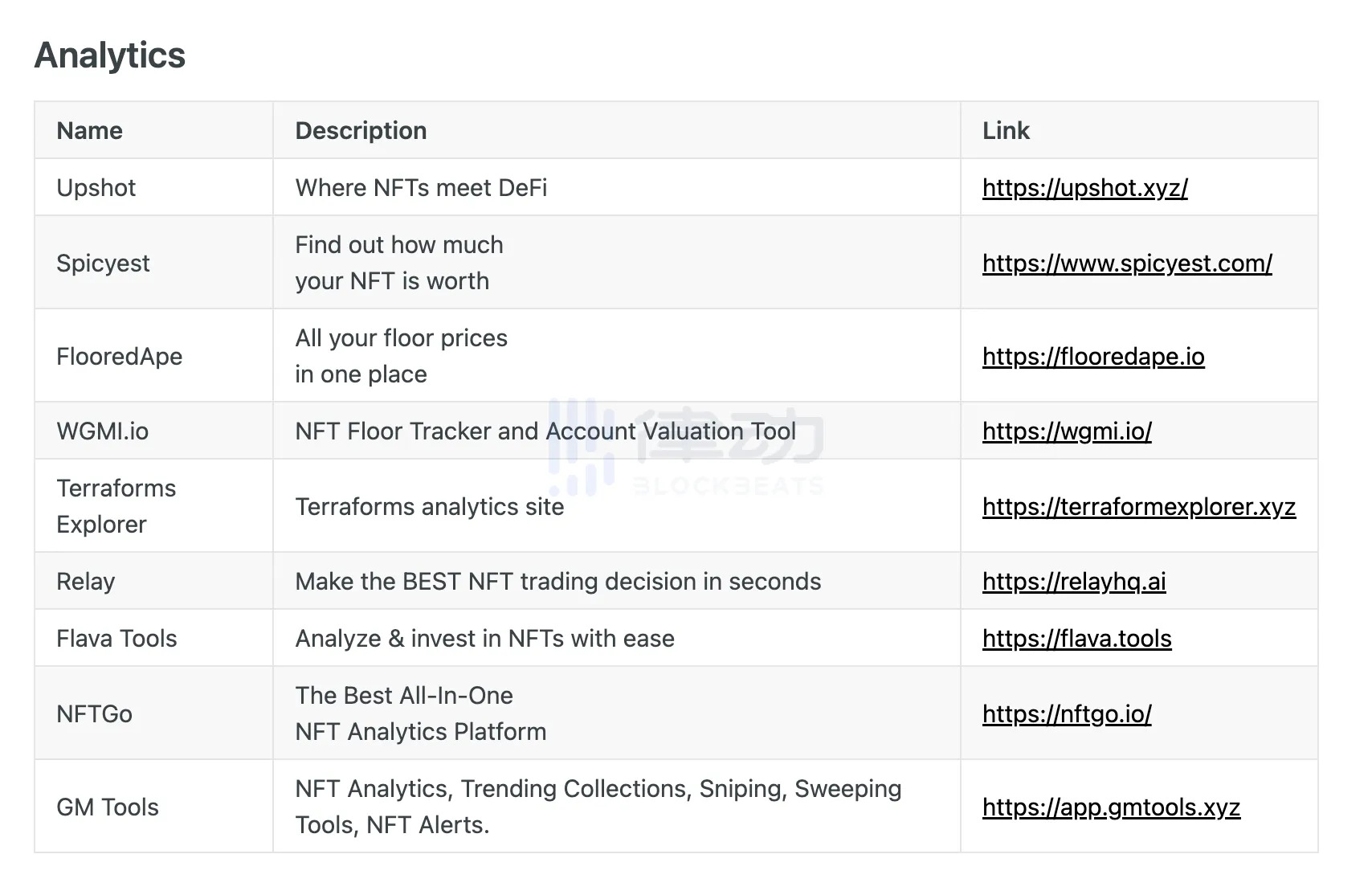 目前采用的分析工具有:Upshot、NFTGo、WGMI.io 和 FlooredApe 等。