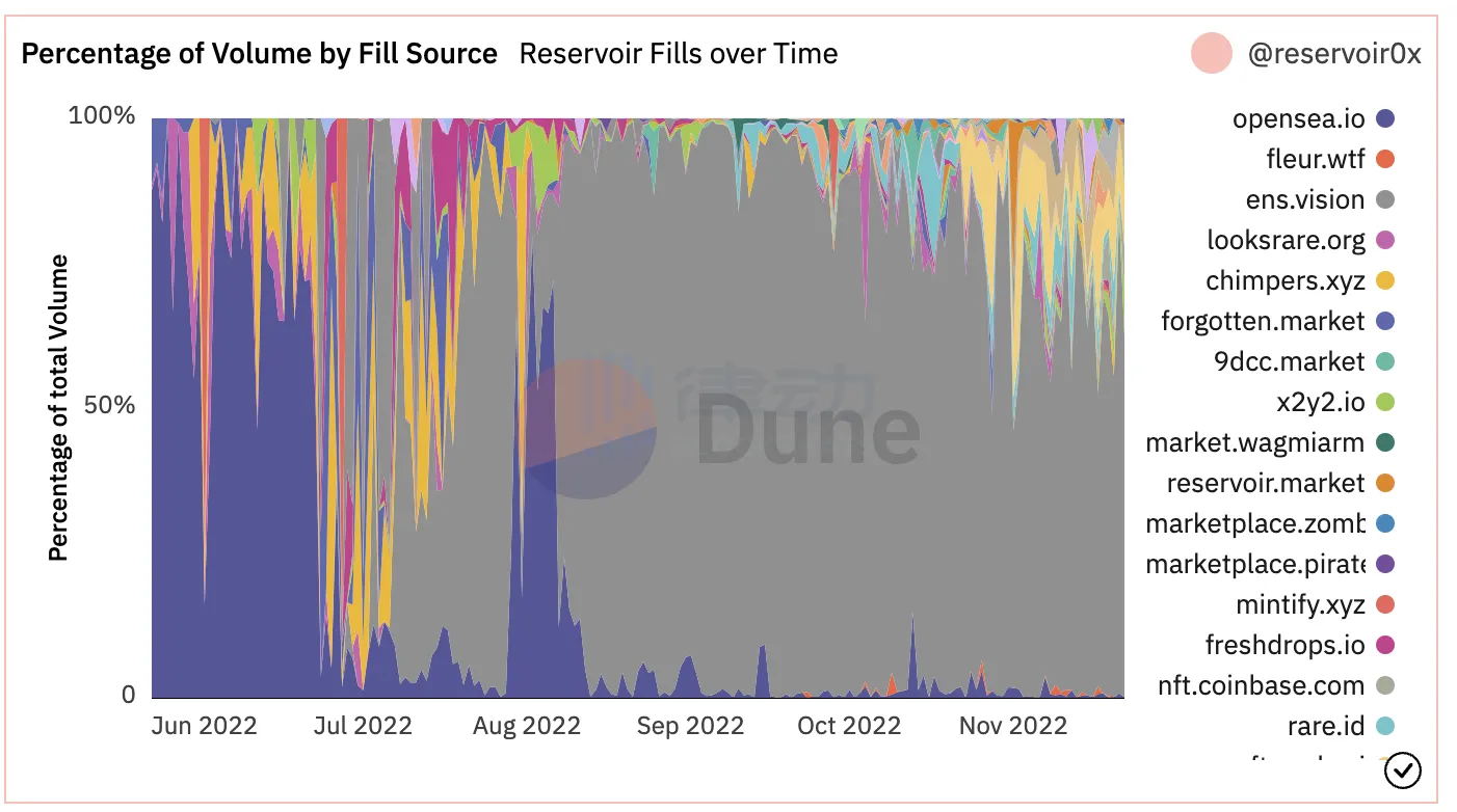 各 NFT 市场采用 Reservoir 执行交易占比数据