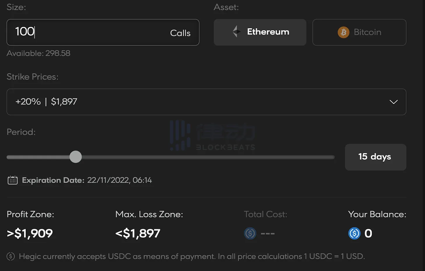 每个期权都有特定的执行价和到期日以及理论上的规模。例如,用户可以在 Hegic 上以 1899 美元的价格购买 100 ETH 看涨期权,期限为 15 天,期间如果现货 ETH 高于 1899 美元,用户将可以行使购买 100 ETH 的权利,并从现货价格与 1899 美元之间的差额中获利,减去期权溢价成本。