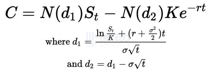 传统的期权定价采用 Black-Scholes-Merton 模型,大多数点对池期权协议在本质上解决了两件事:利用 Black-Scholes Merton 模型对链上期权溢价定价;确保价格以自动化方式及时更新,下图中的公式可以帮助了解 Black-Scholes-Merton 模型的复杂程度。