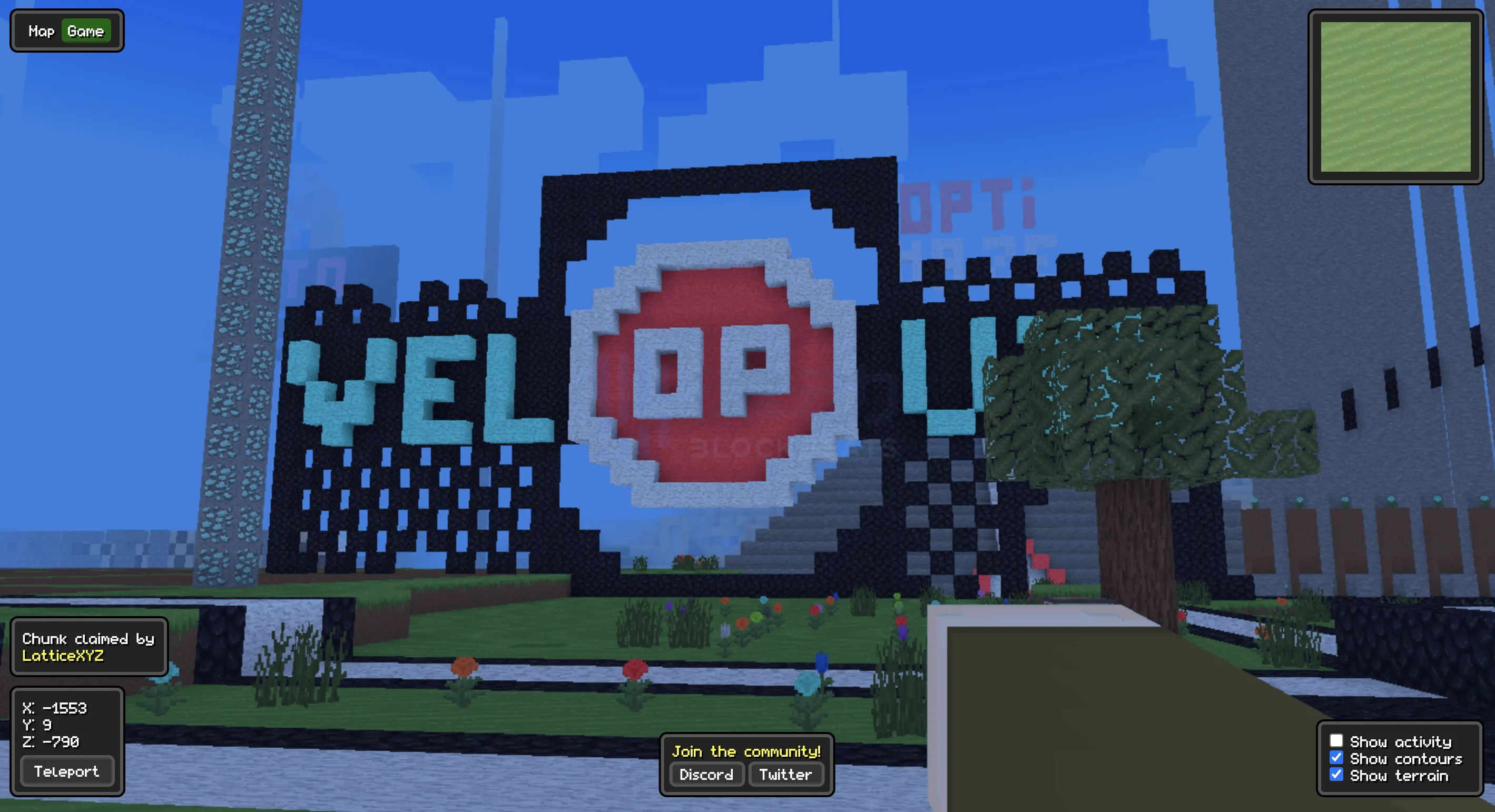 OPCraft 的游戏形式基本复制了著名的我的世界(MineCraft)的游戏形式,因此不需要太多介绍。更重要的是,其中玩家对虚拟世界的修改或建造信息,都被存储到了链上。我们目前依然可以通过这个链接,了解当时在波哥大现场各个参与体验的玩家所创造的物品或图像。MUD 游戏引擎与全链游戏未来的潜力可见一斑。
