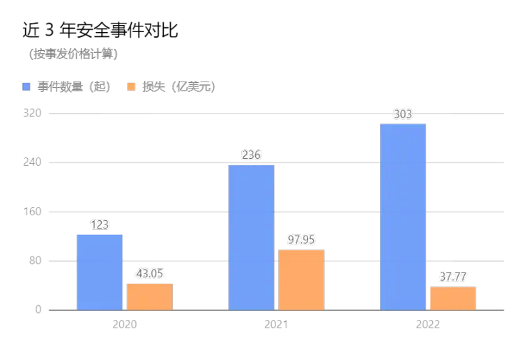 根据慢雾区块链被黑事件档案库(SlowMist Hacked)统计,2022 年安全事件共 303 件,损失高达 37.77 亿美元(按事发价格计算)。