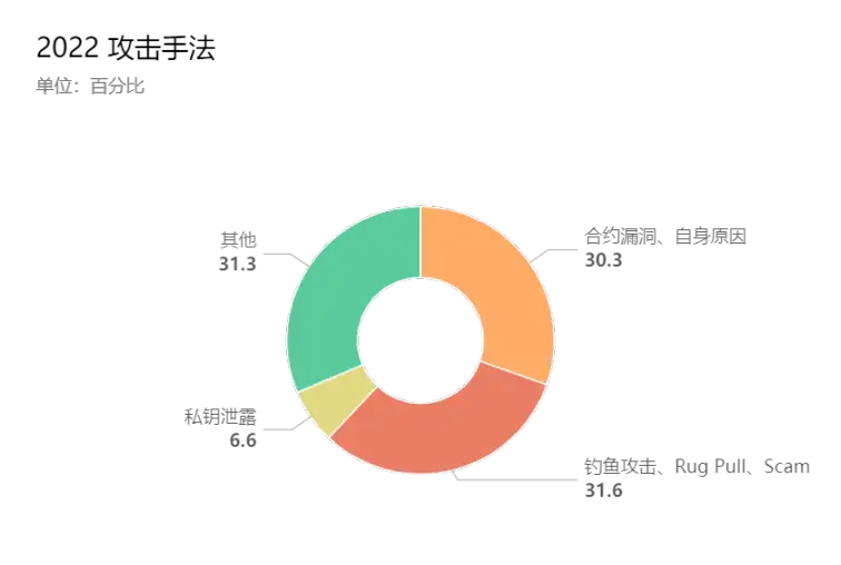 303 起安全事件中,攻击手法主要分为三类:由项目自身设计缺陷和各种合约漏洞引起的攻击;包含 Rug Pull、钓鱼、Scam 类型的手法;由私钥泄露引起的资产损失。