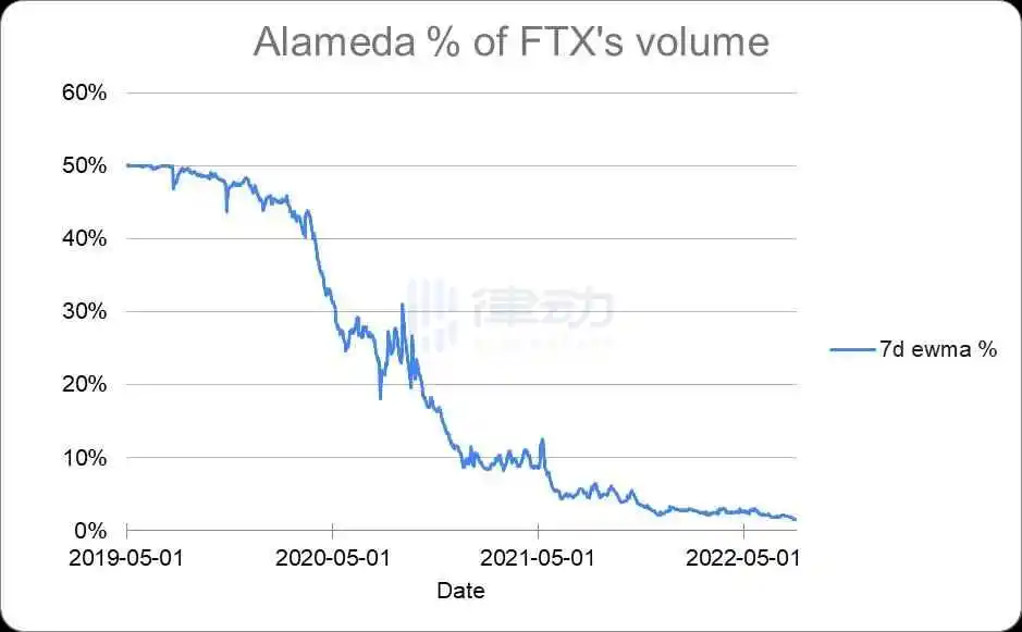 虽然 FTX 的流动性从 2019 年开始主要依赖 Alameda,但到 2022 年,FTX 流动性就已经多样化了,Alameda 在 FTX 的交易量中下降到 2% 左右。