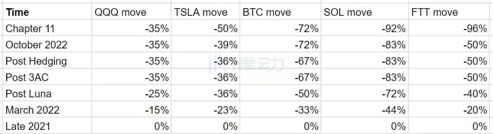 直到 11 月的 FTX 崩溃,QQQ 的波动幅度约为 Alameda 投资组合的一半,BTC/ETH 的波动幅度约为 80%,这意味着 Alameda 的对冲 (QQQ/BTC/ETH) 在一定程度上是有效的。在 3AC 崩盘之前,对冲还不够大,但到 2022 年 10 月,不幸的是,它们终于足够大了。