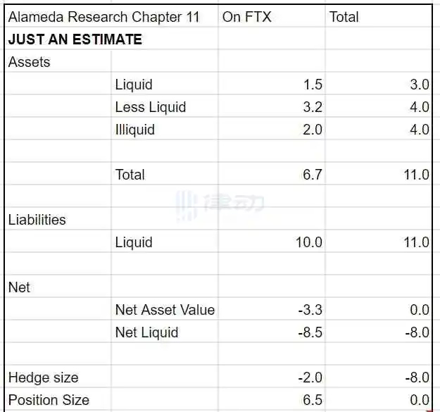 到 2022 年 11 月 10 日,Alameda 的资产负债表上只剩下约 80 亿美元 (仅为半流动性) 资产,而流动负债大致相同,约为 80 亿美元:
