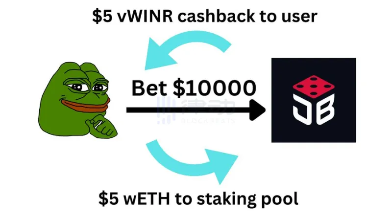 为了激励玩家参与协议的增长,$wETH 中每次下注的 %(0.1% 至 0.05%)将发送到质押池并以 $vWINR 的形式退还给玩家。例如,假设青蛙投注 10,000 美元,5 美元被送入 $vWINR 质押池,而 $5 $vWINR 还给青蛙。