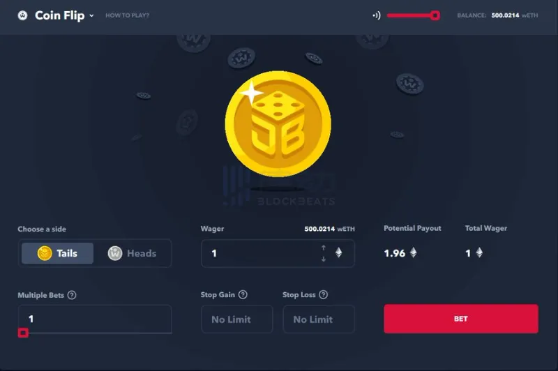JustBet 的所有投注都是以$wETH 进行的,奖励也是以 $wETH 支付的,只需导航到游戏页面,就可以开始投注 Coinflip、Moon、彩票等。