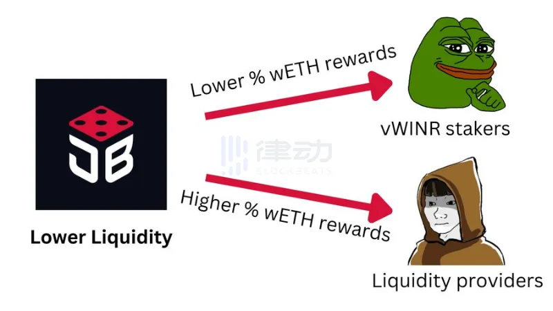 反之,当流动性为下降时,LP 会获得更多 $wETH 奖励,以激励他们提供流动性。这使得平衡变得自动化,这会自动平衡并确保 LP、$vWINR 质押者和用户受到激励以平衡平台上的流动性和质押以促进协议增长。