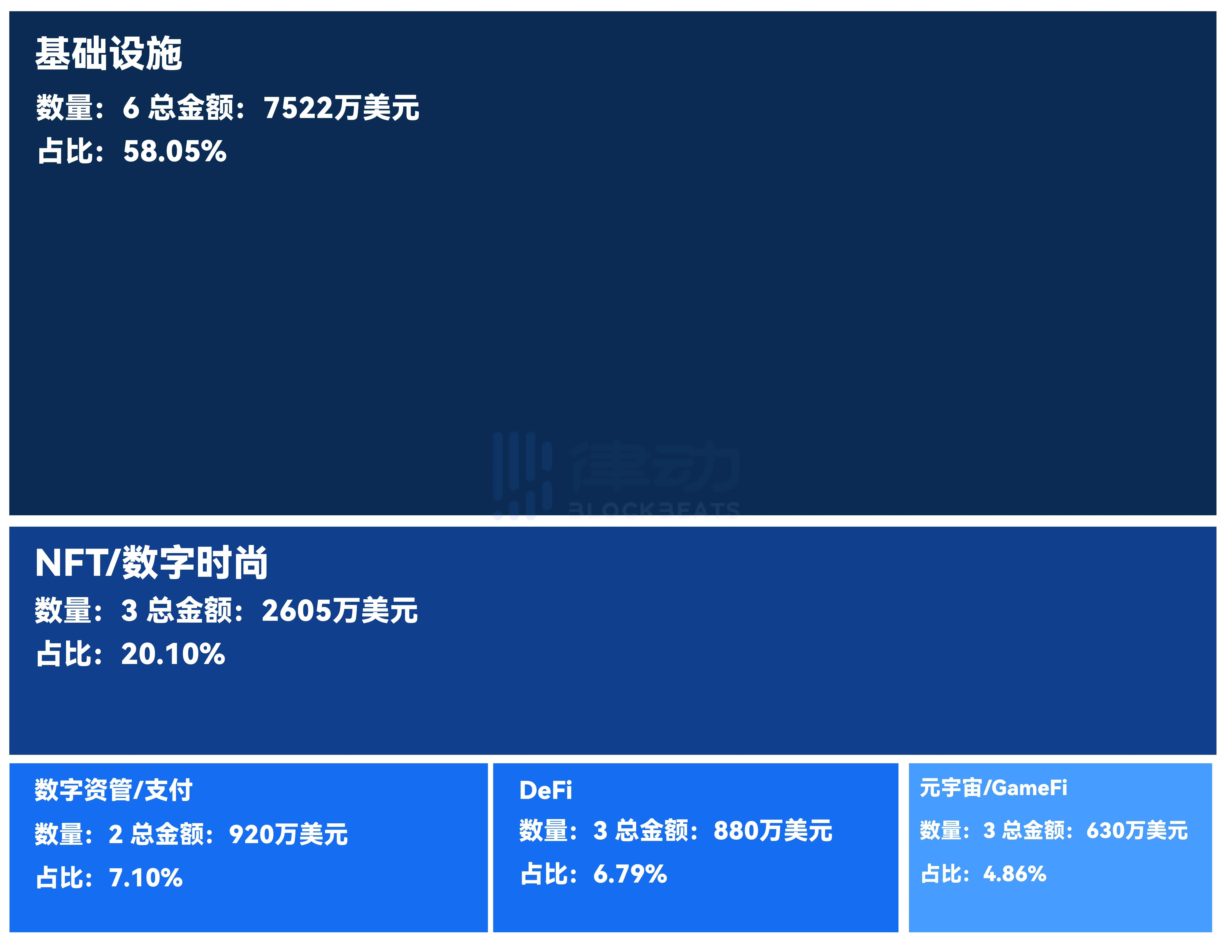 在 DeFi 领域共计 3 笔融资,总金额 880 万美元,占上周融资总额的 6.79%。