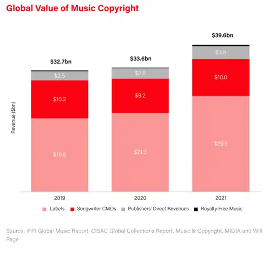Spotify 前首席经济学家 Will Page 在汇集了 IFPI 全球音乐报告、CISAC 全球收藏报告、Music & Copyright 和 MIDIA 的数据后,分析得出,2021 年音乐版权的全球价值已经高达 396 亿美元,同比增长 18%。其中,价值主要源自流媒体和以及歌曲作者管理协会。
