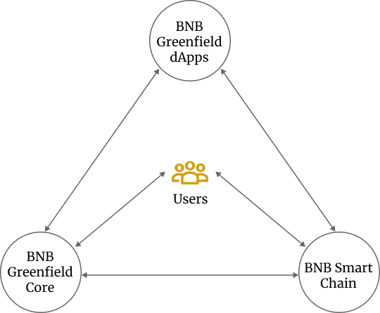 在架构上,BNB Greenfield 使用三位一体的架构,从而达到与 BNB Smart Chain 原生整合的效果。BNB Greenfield Core 由 Greenfield 区块链网络和存储服务基础设施提供商组成的 Storage Provider(SP)网络组成。Greenfield 区块链网络与 BNB 智能链之间具有原生跨链桥,相关数据操作可以转移到 BNB 智能链并与 BNB 智能链智能合约系统集成。